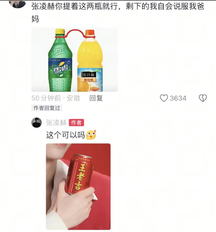 看到这样的消息,很多网友都想到网友们的玩梗,当时有网友表示:张凌赫,你就拎着这两瓶就行,剩下的我会说服我爸妈,结果张凌赫真的评论了,竟带着王老吉来了。